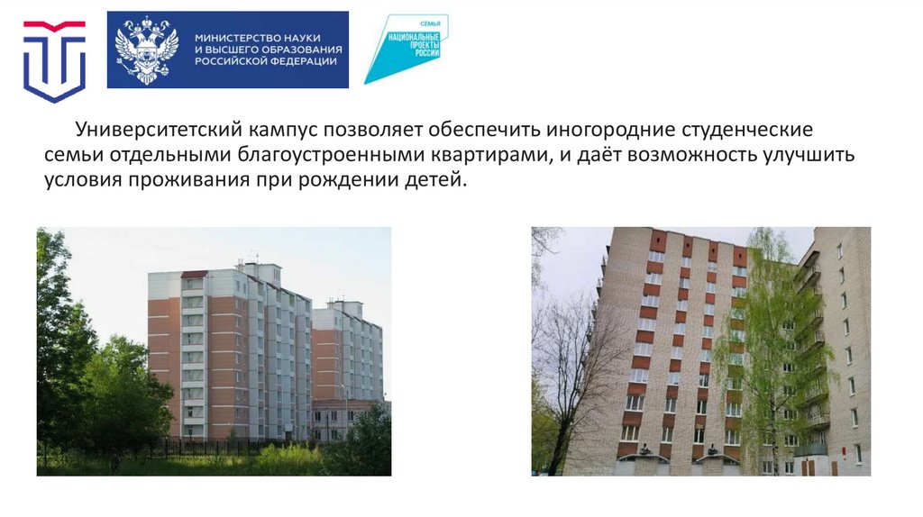 Университетский кампус позволяет обеспечить иногородние студенческиесемьи отдельными благоустроенными квартирами, и даёт возможность улучшить