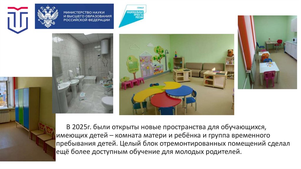 В 2025г. были открыты новые пространства для обучающихся,имеющих детей – комната матери и ребёнка и группа временного