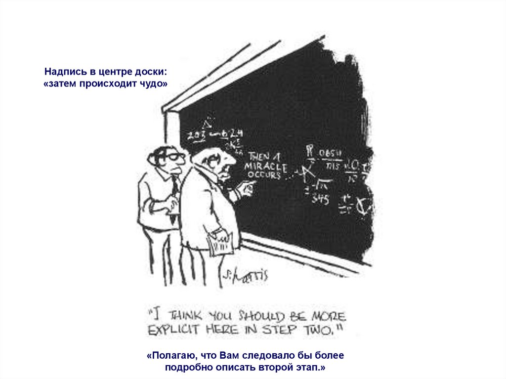 Надпись в центре доски:«затем происходит чудо»