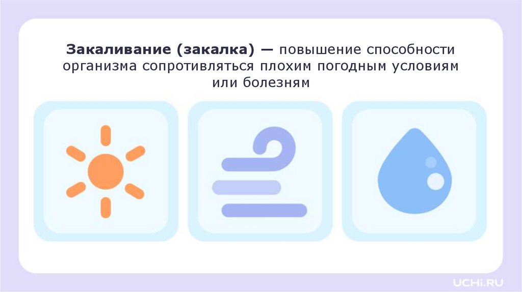 Закаливание (закалка) — повышение способностиорганизма сопротивляться плохим погодным условиям