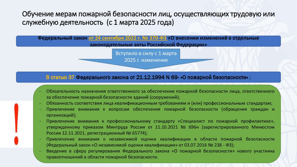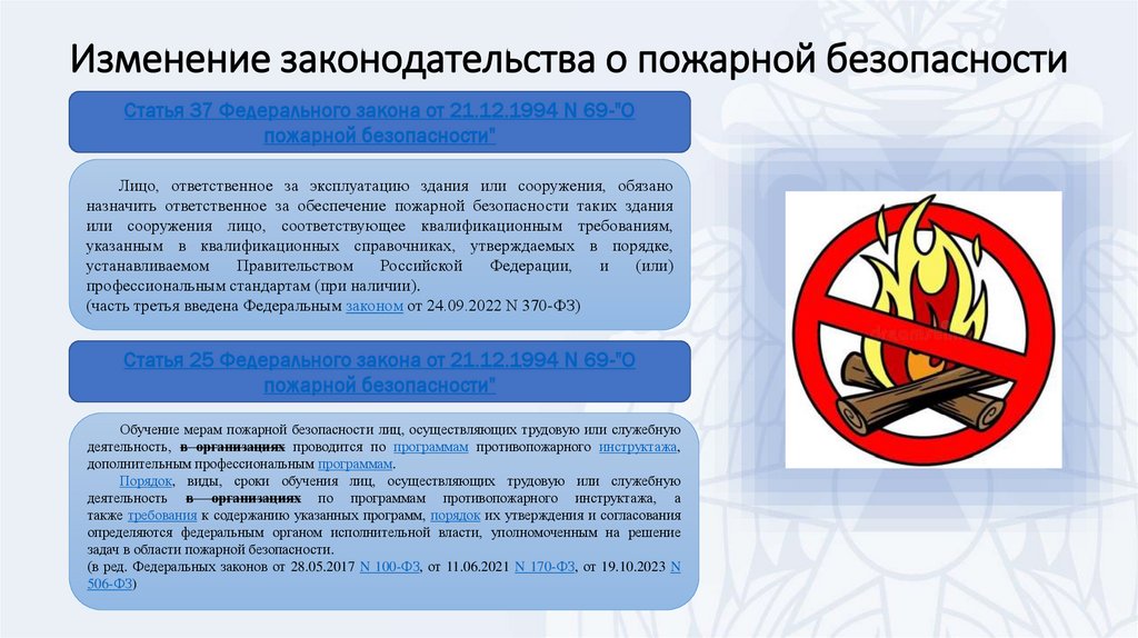• Вместе с тем положениями ФЗ от 21.12.1994 г. №69-ФЗ «О пожарной безопасности» в редакции Федерального Закона №370 от