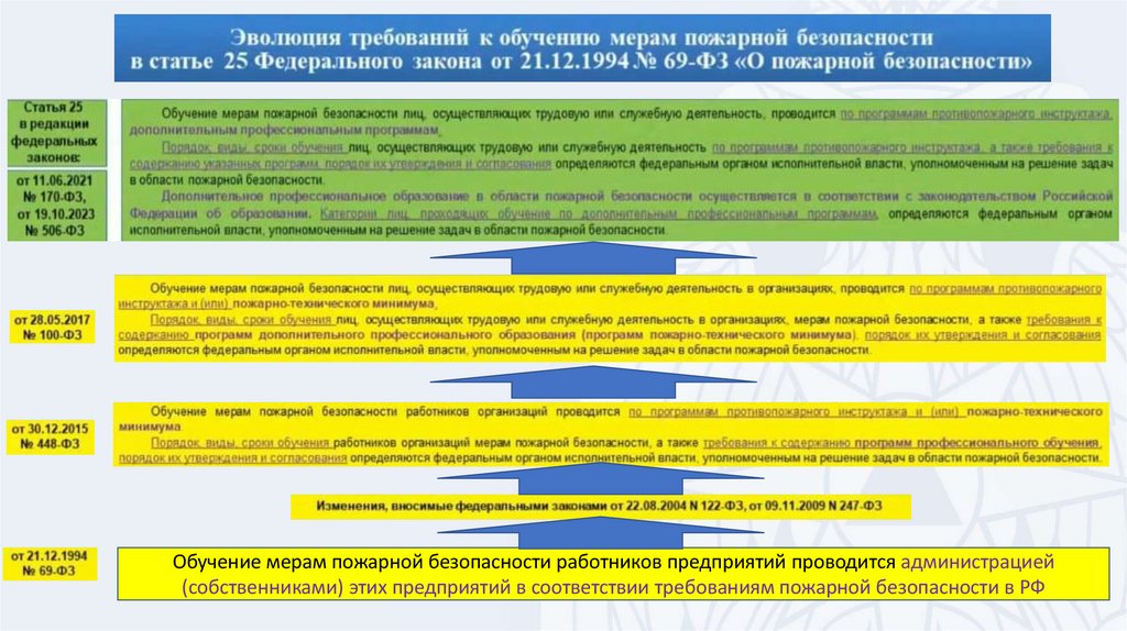 Обучение мерам пожарной безопасности работников предприятий проводится администрацией(собственниками) этих предприятий в соответствии требованиям пожарной безопасности в РФ