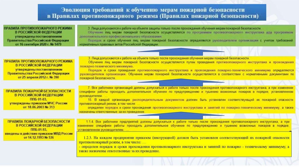 1.2.3. На каждом предприятии приказом (инструкцией) должен быть установлен соответствующий их пожарной опасностипротивопожарный режим, в том числе: …