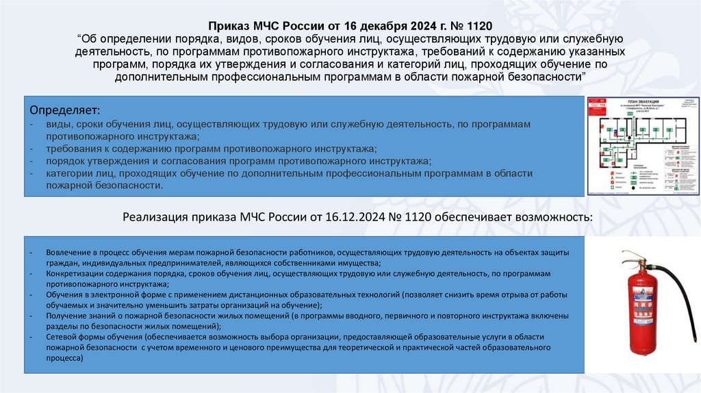Приказ МЧС России от 16 декабря 2024 г. № 1120“Об определении порядка, видов, сроков обучения лиц, осуществляющих трудовую или служебную