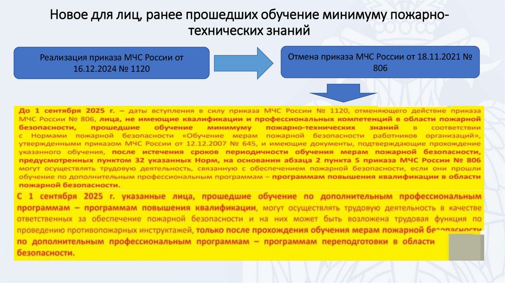 Новое для лиц, ранее прошедших обучение минимуму пожарнотехнических знанийРеализация приказа МЧС России от