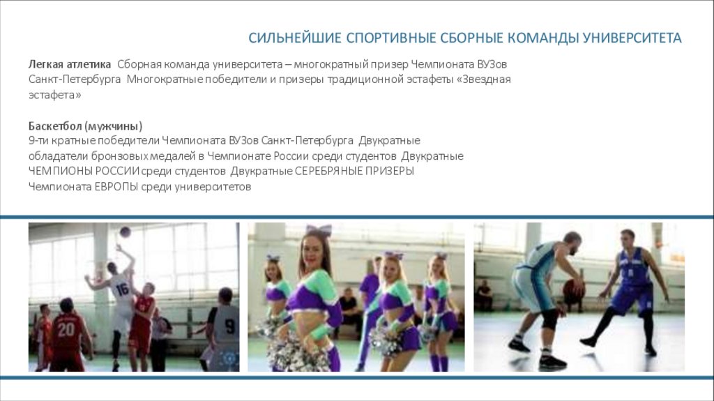 Легкая атлетика Сборная команда университета – многократный призер Чемпионата ВУЗовСанкт-Петербурга Многократные победители и призеры традиционной эстафеты «Звездная