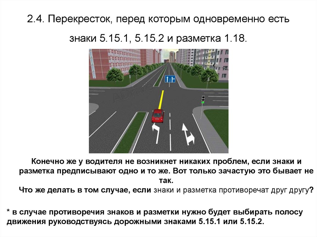 2.4. Перекресток, перед которым одновременно естьзнаки 5.15.1, 5.15.2 и разметка 1.18.