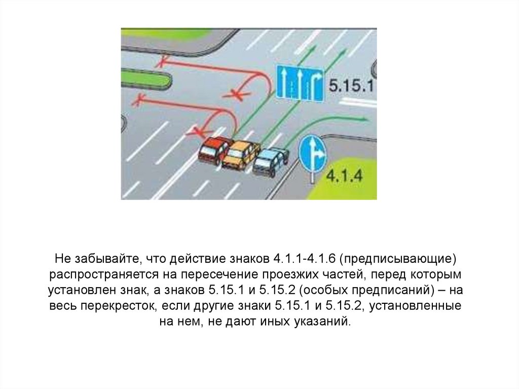 Не забывайте, что действие знаков 4.1.1-4.1.6 (предписывающие)распространяется на пересечение проезжих частей, перед которым