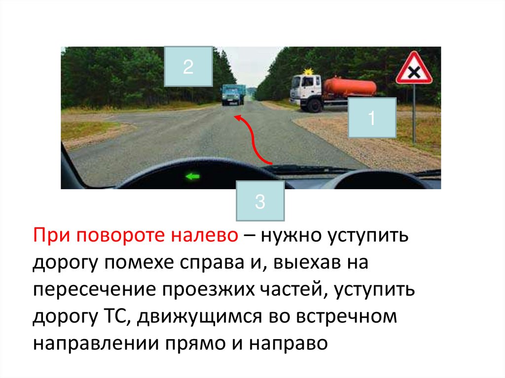 3. При повороте налево – нужно уступить дорогу помехе
