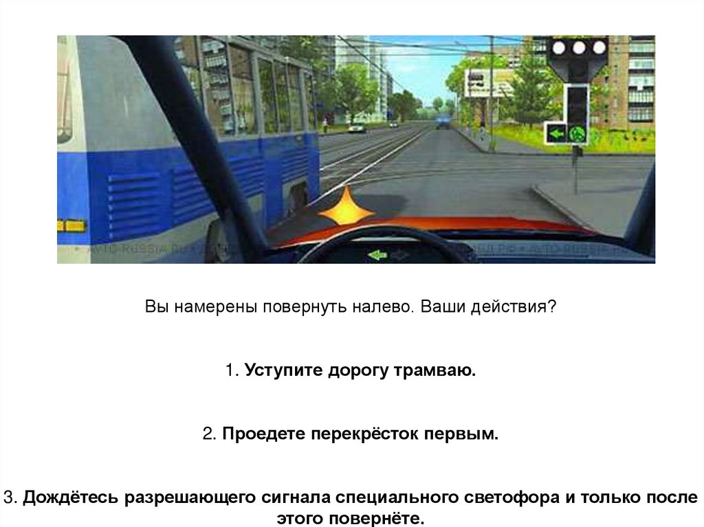 Вы намерены повернуть налево. Ваши действия?1. Уступите дорогу трамваю.