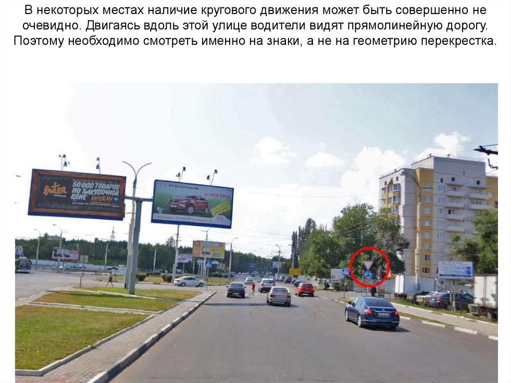 В некоторых местах наличие кругового движения может быть совершенно неочевидно. Двигаясь вдоль этой улице водители видят прямолинейную дорогу.