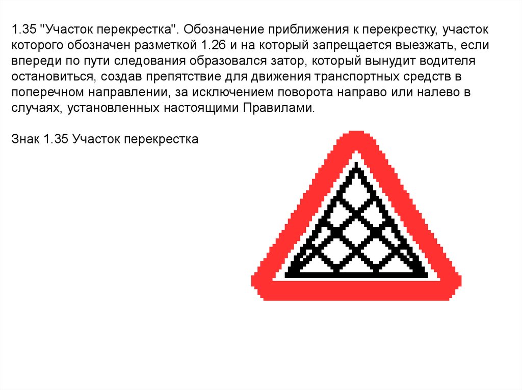 1.35 "Участок перекрестка". Обозначение приближения к перекрестку, участоккоторого обозначен разметкой 1.26 и на который запрещается выезжать, если