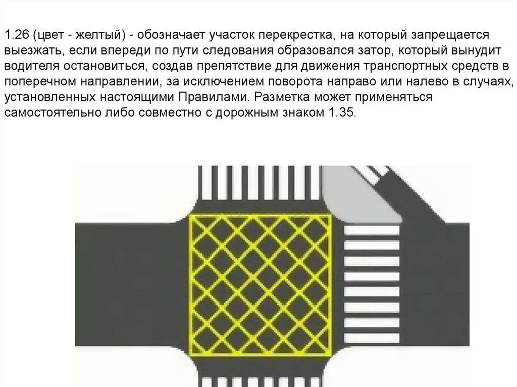 1.26 (цвет - желтый) - обозначает участок перекрестка, на который запрещаетсявыезжать, если впереди по пути следования образовался затор, который вынудит