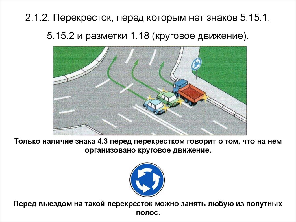 2.1.2. Перекресток, перед которым нет знаков 5.15.1,5.15.2 и разметки 1.18 (круговое движение).
