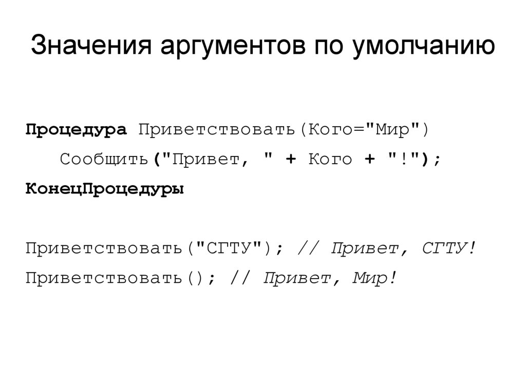 Значения аргументов по умолчаниюПроцедура Приветствовать(Кого="Мир")
