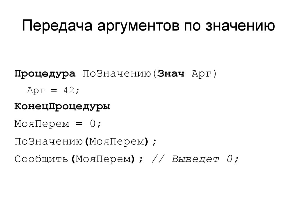 Передача аргументов по значениюПроцедура ПоЗначению(Знач Арг)
