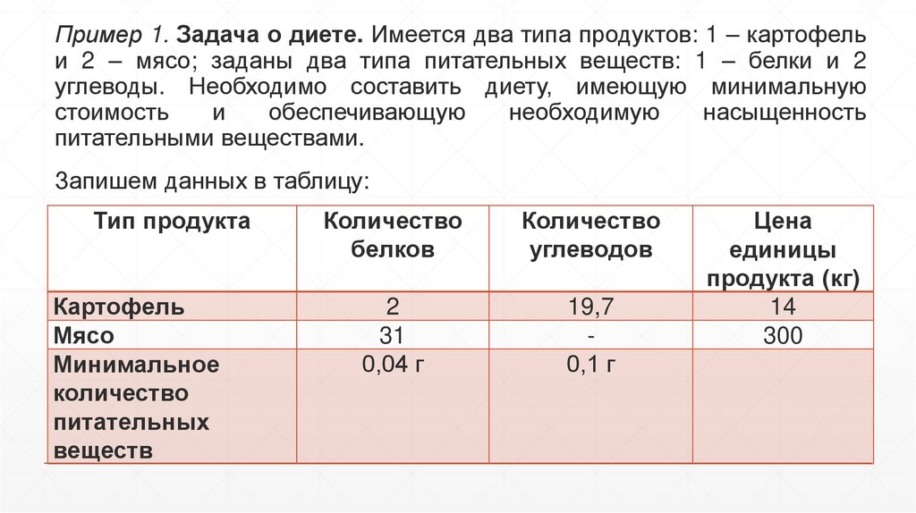 Пример 1. Задача о диете. Имеется два типа продуктов: 1 – картофельи 2 – мясо; заданы два типа питательных веществ: 1 – белки и 2