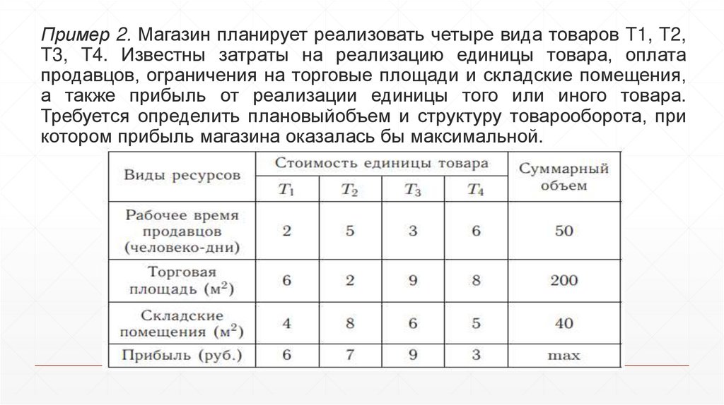 Пример 2. Магазин планирует реализовать четыре вида товаров T1, T2,T3, T4. Известны затраты на реализацию единицы товара, оплата