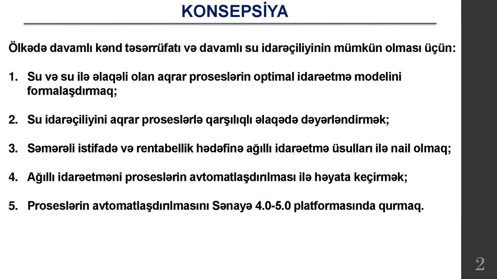KONSEPSİYAÖlkədə davamlı kənd təsərrüfatı və davamlı su idarəçiliyinin mümkün olması üçün: