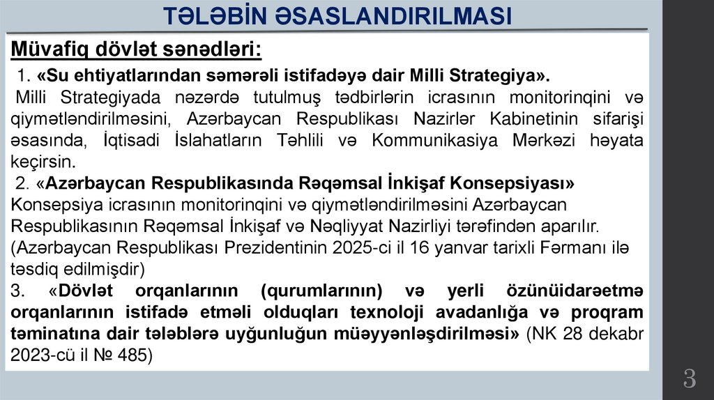 TƏLƏBİN ƏSASLANDIRILMASIMüvafiq dövlət sənədləri: