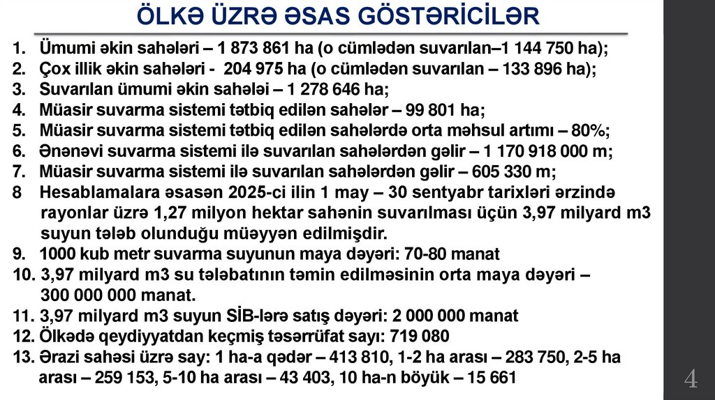ÖLKƏ ÜZRƏ ƏSAS GÖSTƏRİCİLƏRÜmumi əkin sahələri – 1 873 861 ha (o cümlədən suvarılan–1 144 750 ha);
