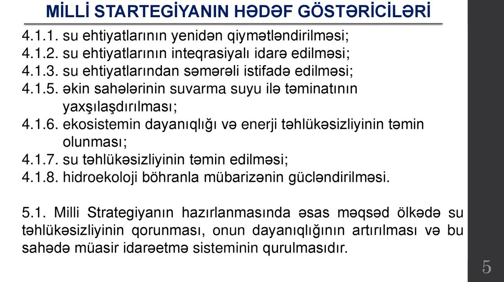 MİLLİ STARTEGİYANIN HƏDƏF GÖSTƏRİCİLƏRİ4.1.1. su ehtiyatlarının yenidən qiymətləndirilməsi;