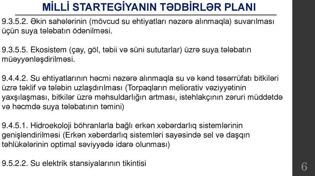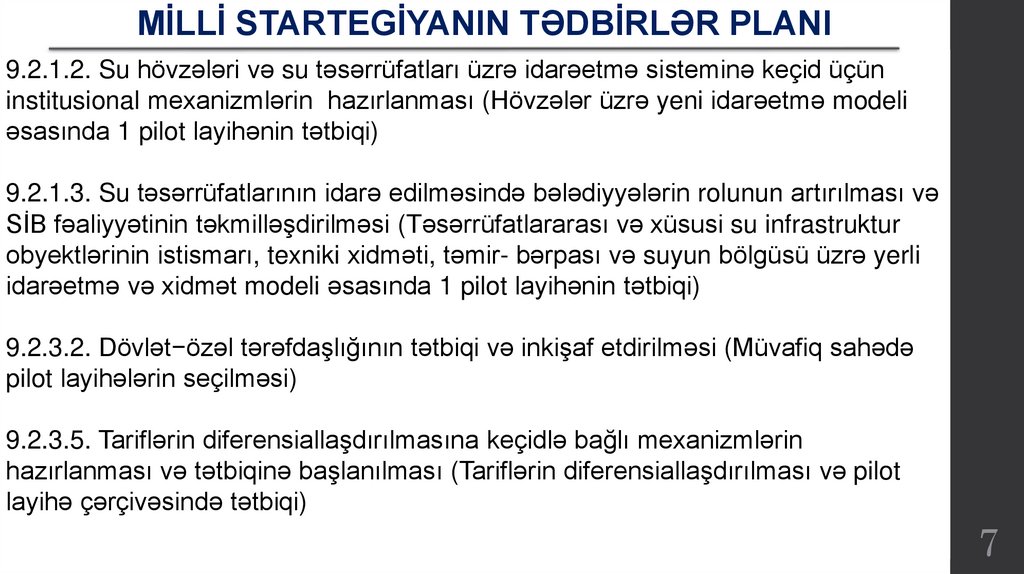 MİLLİ STARTEGİYANIN TƏDBİRLƏR PLANI9.2.1.2. Su hövzələri və su təsərrüfatları üzrə idarəetmə sisteminə keçid üçün