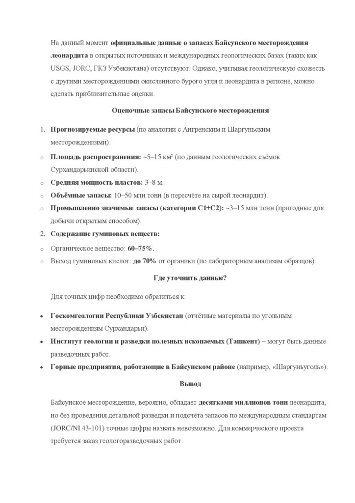 На данный момент официальные данные о запасах Байсунского месторождениялеонардита в открытых источниках и международных геологических базах (таких как