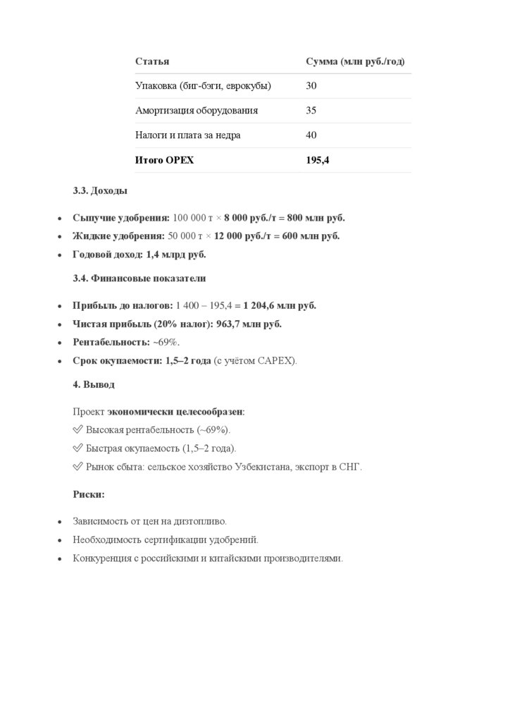 Итог: Проект перспективен для инвесторов, готовых вложить ~450 млн руб. с ожидаемой