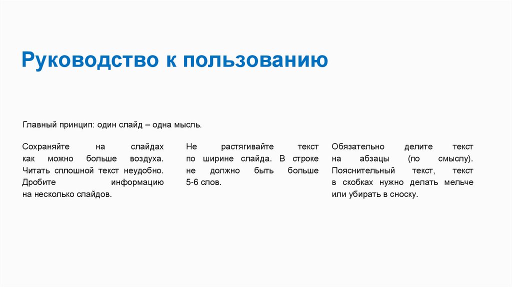 Руководство к пользованиюГлавный принцип: один слайд – одна мысль.