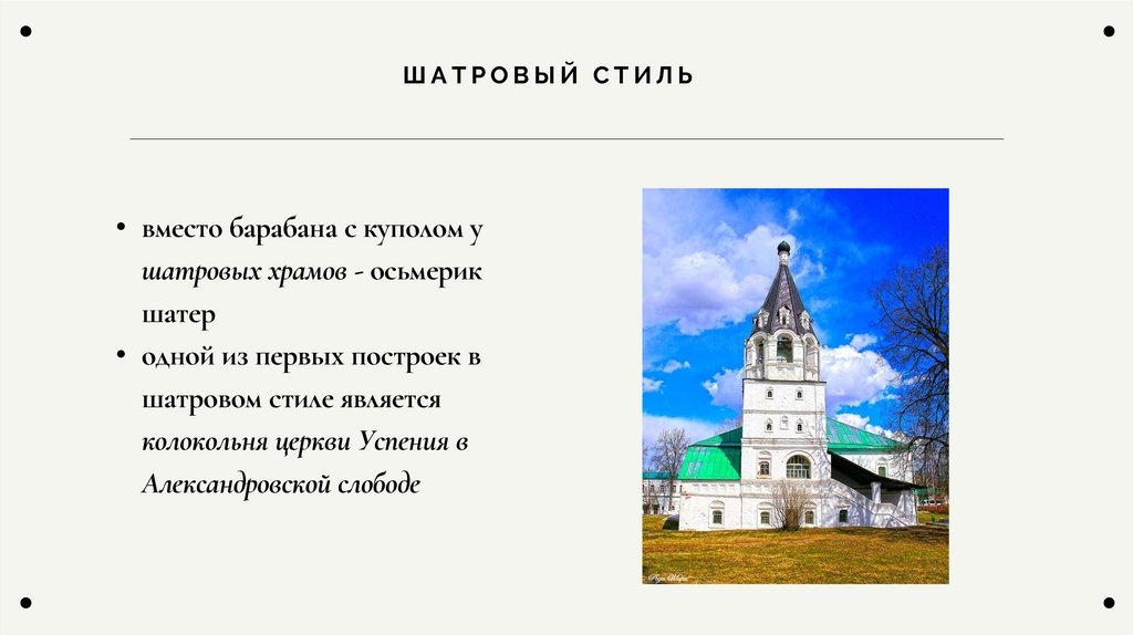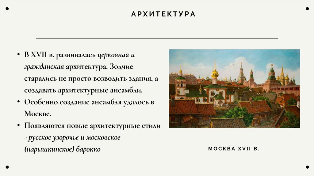 АРХИТЕКТУРА• В XVII в. развивалась церковная и