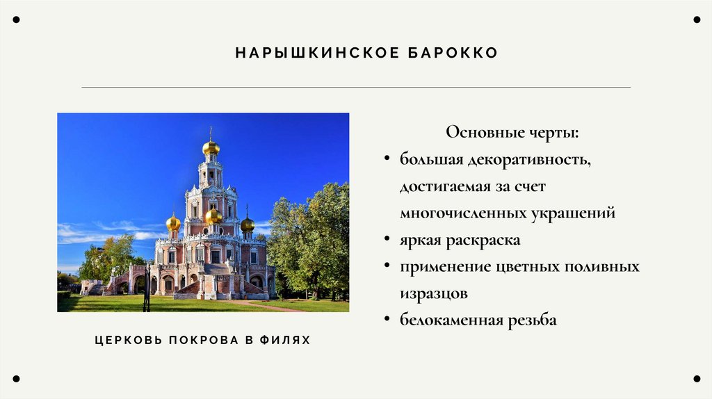 НАРЫШКИНСКОЕ БАРОККООсновные черты: