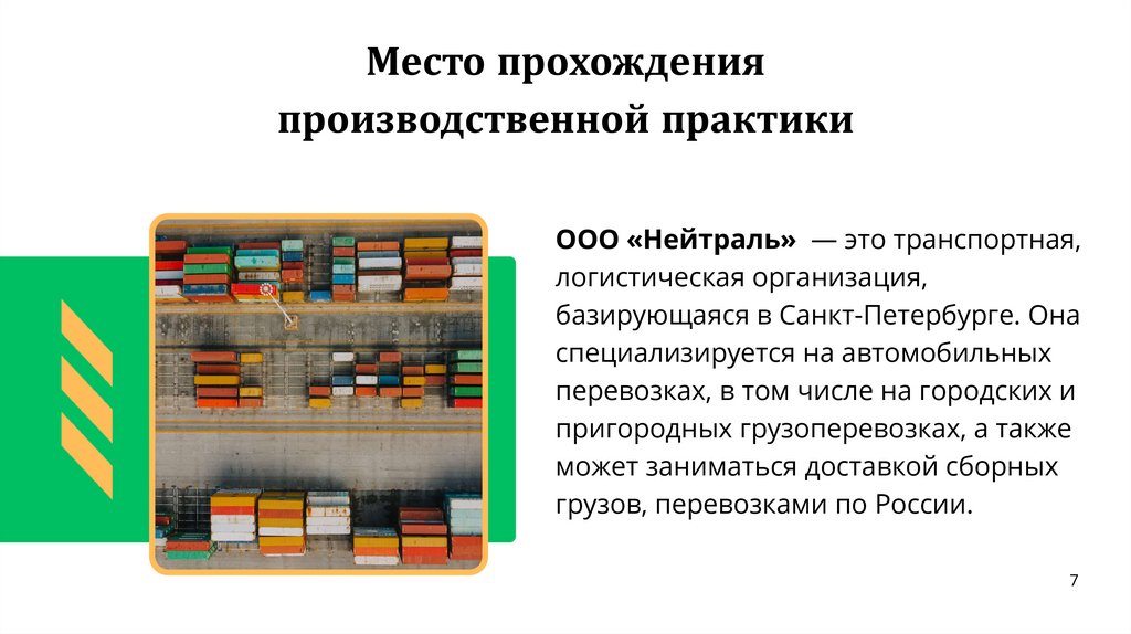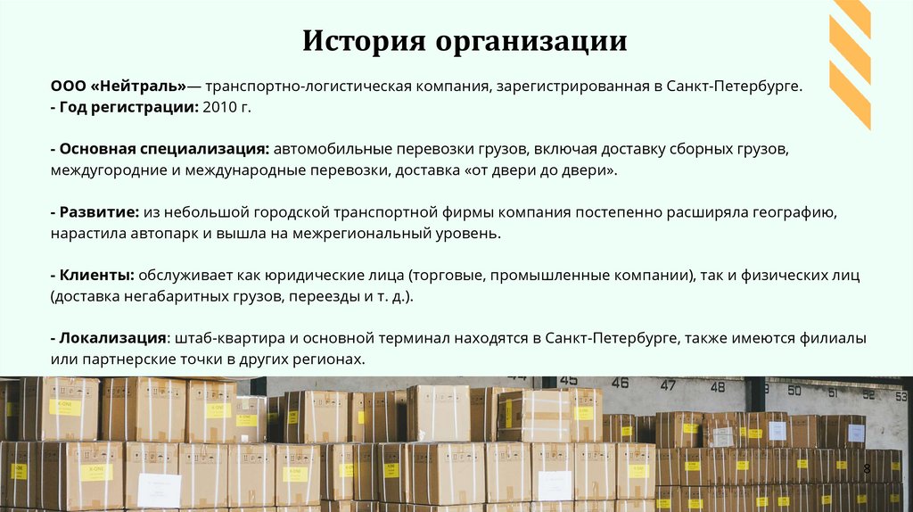 История организацииООО «Нейтраль»— транспортно-логистическая компания, зарегистрированная в Санкт-Петербурге.