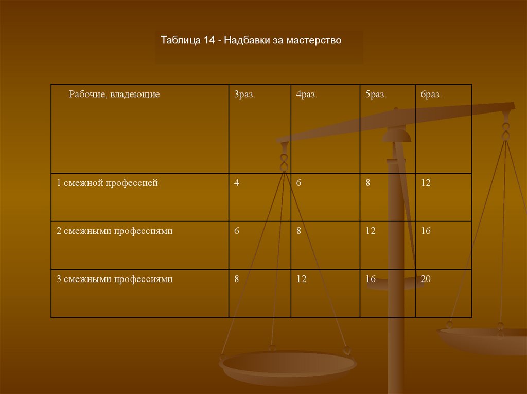 Таблица 14 - Надбавки за мастерствоРабочие, владеющие