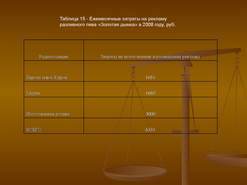Таблица 15 - Ежемесячные затраты на рекламуразливного пива «Золотая дымка» в 2008 году, руб.