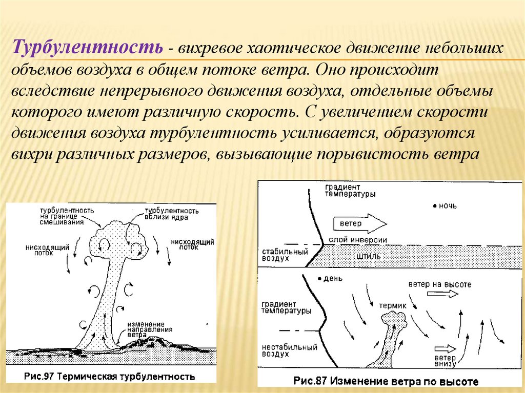Турбулентность - вихревое хаотическое движение небольшихобъемов воздуха в общем потоке ветра. Оно происходит