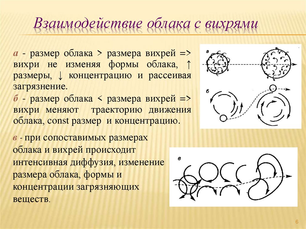 а - размер облака > размера вихрей =>вихри не изменяя формы облака, ↑