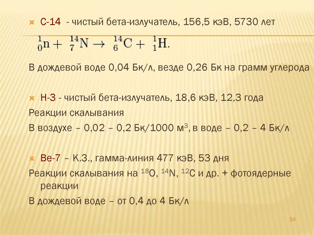С-14 - чистый бета-излучатель, 156,5 кэВ, 5730 летВ дождевой воде 0,04 Бк/л, везде 0,26 Бк на грамм углерода