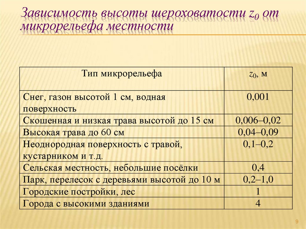 9. Зависимость высоты шероховатости z0 от микрорельефа местности