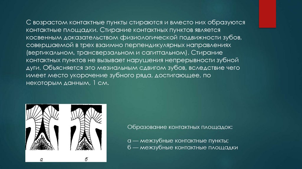 С возрастом контактные пункты стираются и вместо них образуютсяконтактные площадки. Стирание контактных пунктов является