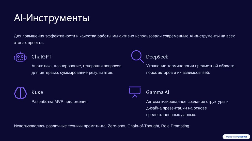AI-ИнструментыДля повышения эффективности и качества работы мы активно использовали современные AI-инструменты на всех