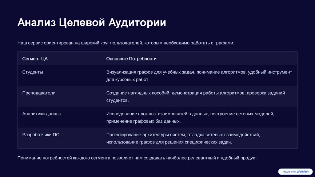 Анализ Целевой АудиторииНаш сервис ориентирован на широкий круг пользователей, которым необходимо работать с графами.