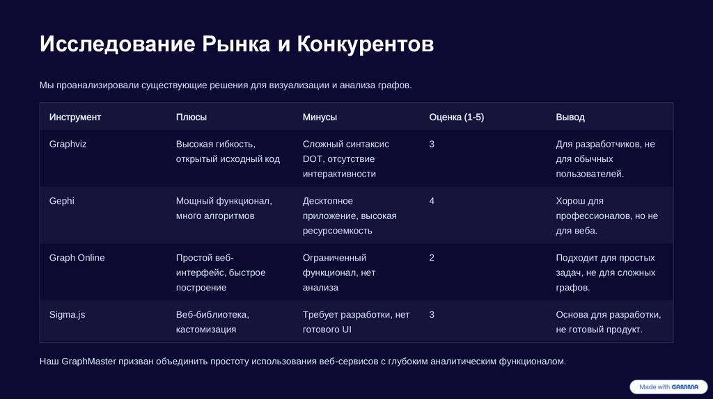 Исследование Рынка и КонкурентовМы проанализировали существующие решения для визуализации и анализа графов.