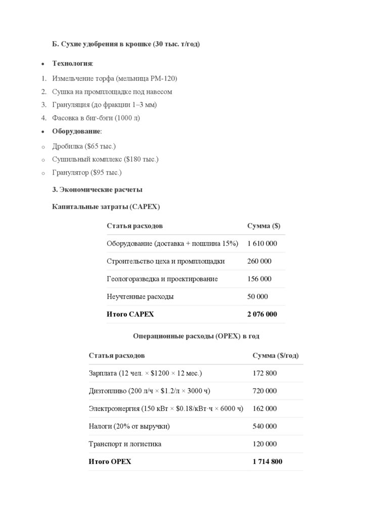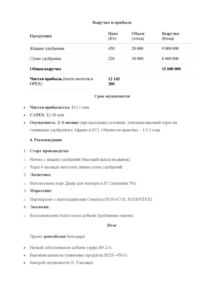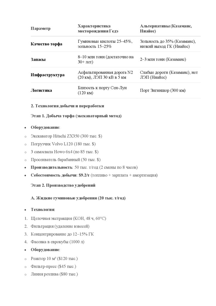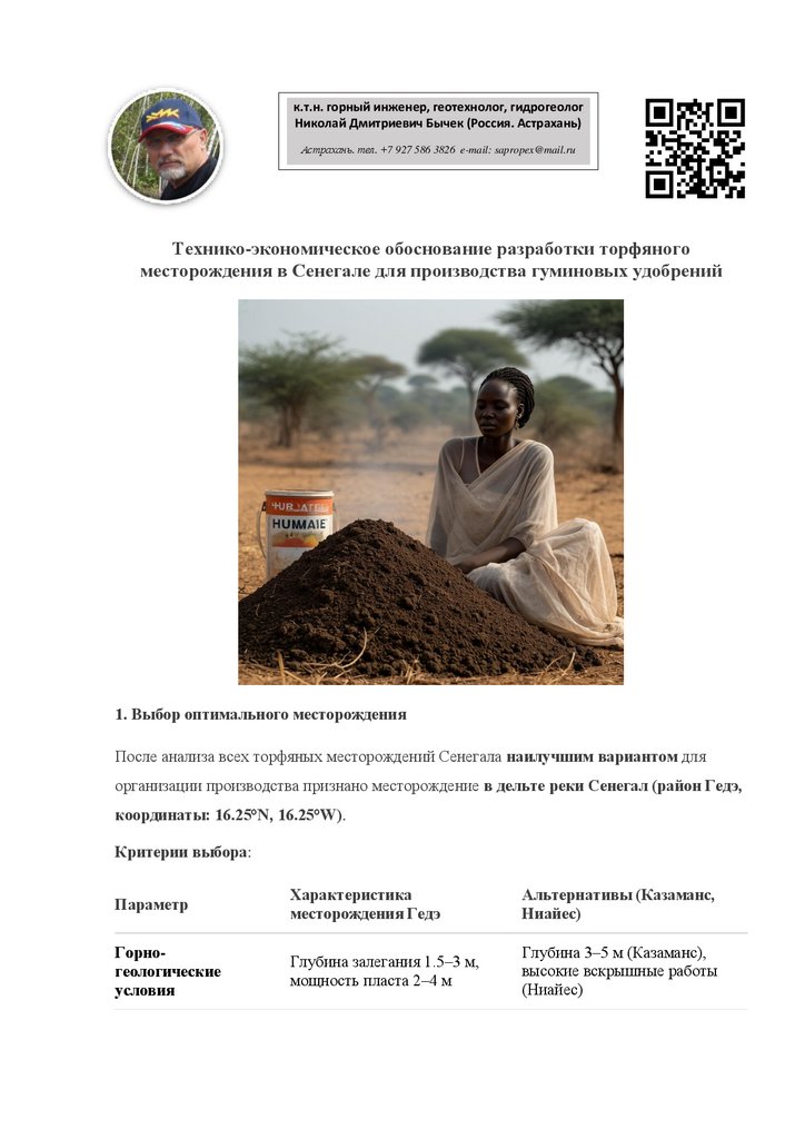 Технико-экономическое обоснование разработки торфяного месторождения в Сенегале для производства гуминовых удобрений