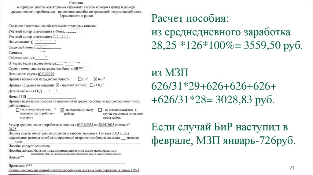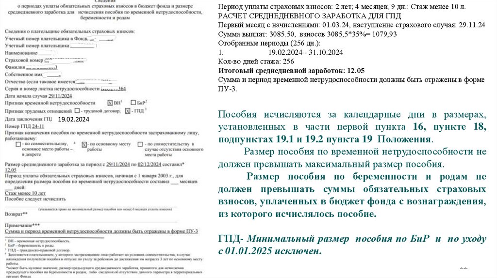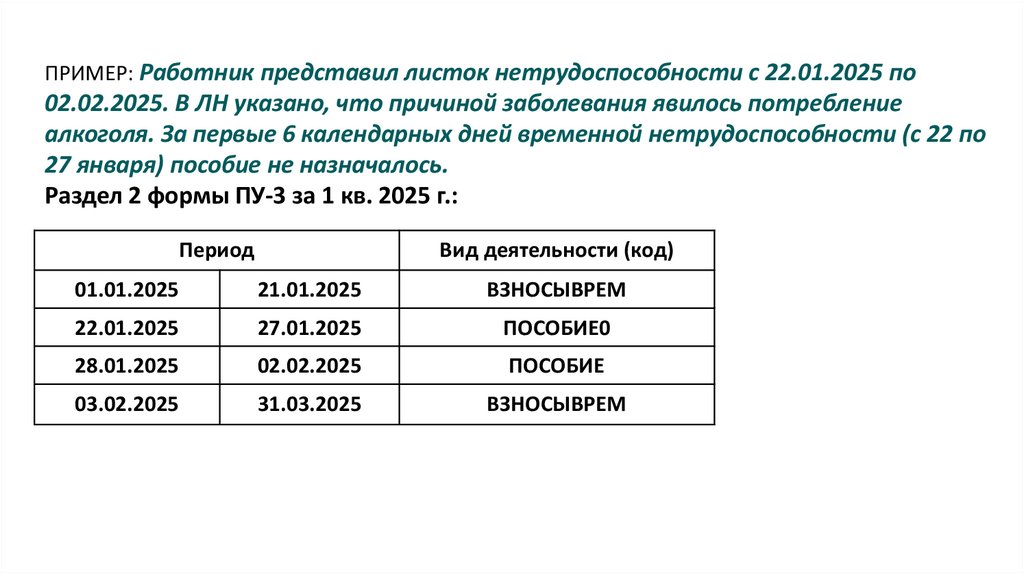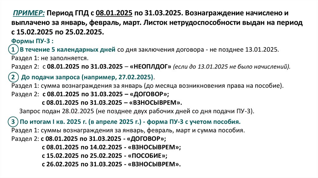 ПРИМЕР: Период ГПД с 08.01.2025 по 31.03.2025. Вознаграждение начислено ивыплачено за январь, февраль, март. Листок нетрудоспособности выдан на период