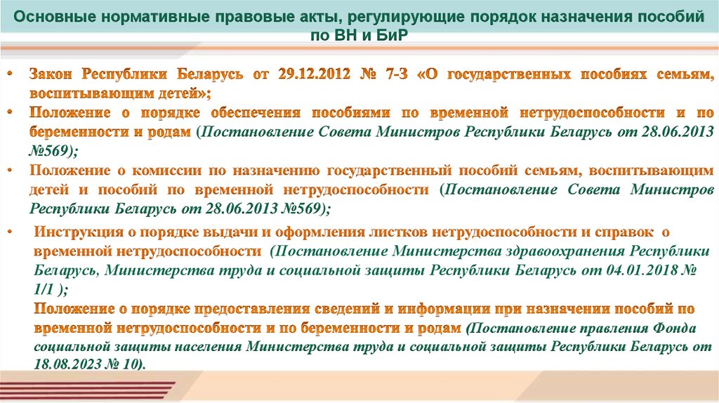 Основные нормативные правовые акты, регулирующие порядок назначения пособийпо ВН и БиР