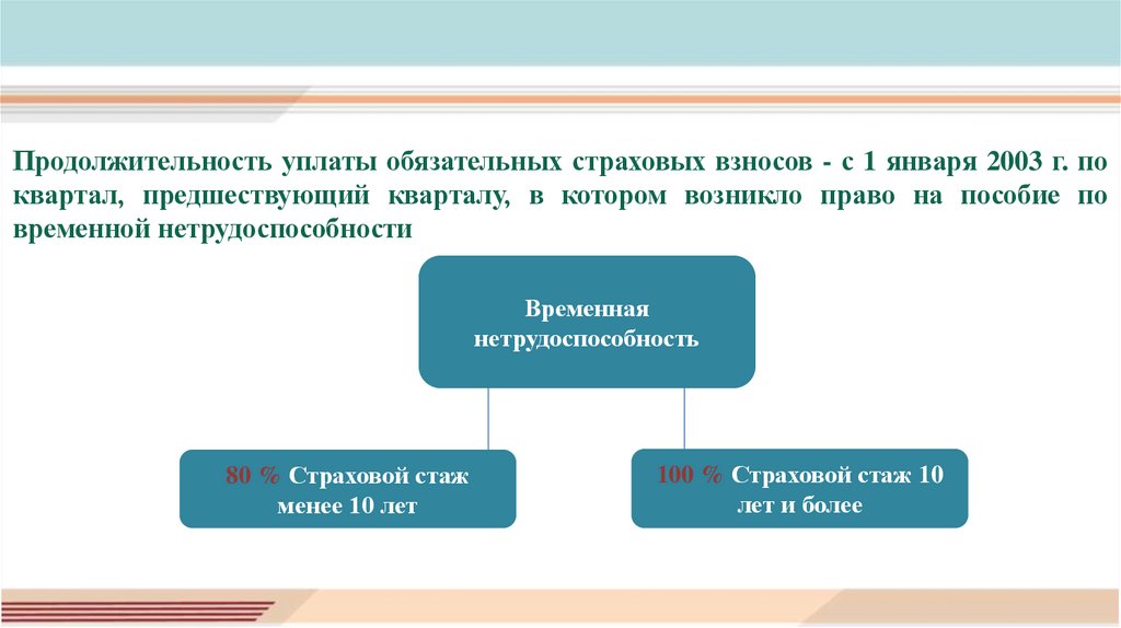 Продолжительность уплаты обязательных страховых взносов - с 1 января 2003 г. поквартал, предшествующий кварталу, в котором возникло право на пособие по