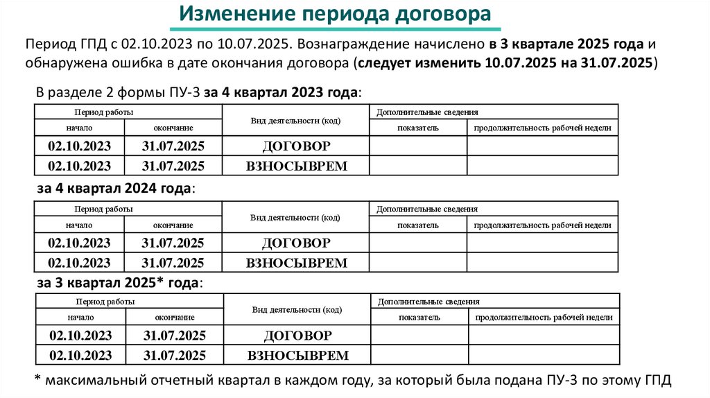 Изменение периода договораПериод ГПД с 02.10.2023 по 10.07.2025. Вознаграждение начислено в 3 квартале 2025 года и