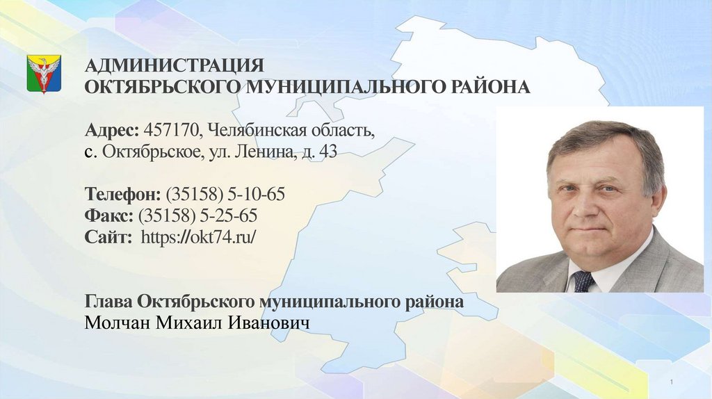 1. АДМИНИСТРАЦИЯ ОКТЯБРЬСКОГО МУНИЦИПАЛЬНОГО РАЙОНА Адрес: 457170, Челябинская область, с. Октябрьское, ул. Ленина, д. 43