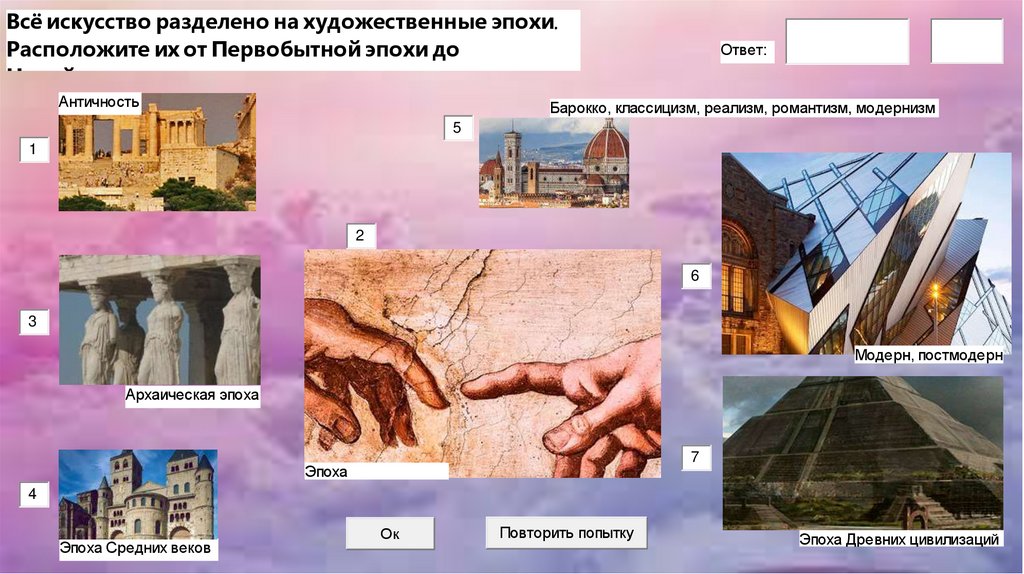 Всё искусство разделено на художественные эпохи.Расположите их от Первобытной эпохи до